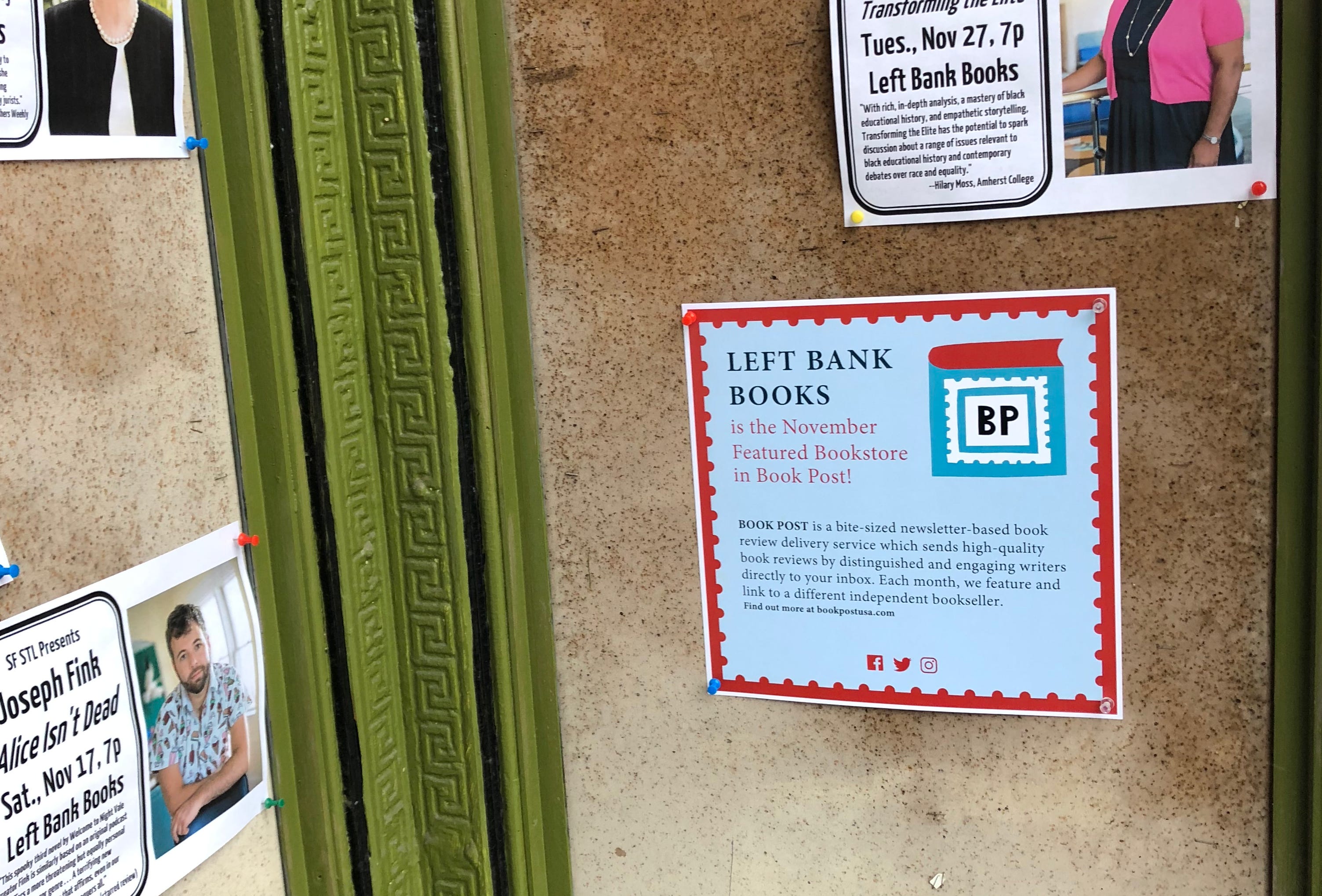 Welcome to the holiday shopping season, Book Post readers! I hope at least some of you are spending your day off on the sofa with a book. Experts have shown (not really) that it’s the best way to metabolize the soporific effects of tryptophan. For our part we’ve been reading Brad Stone’s The Everything Store: Jeff Bezos and the Age of Amazon, in order better to understand the moment, but more on that later. Chances are some of you have trekked back to places you are from, or places your relatives are from, and are knocking about, perhaps readying yourselves for a break from the family. Here’s a suggestion: Why not visit the local bookshop! It’s a great place to while away some time, put you in touch with the zeitgeist even as you imbibe a bit of local flavor. Maybe it was even around when you were a kid, waiting for the latest Harry Potter or Judy Blume (depending). If you don’t have to carry your own luggage back, consider making a pro-local statement and buying a book or two there for your near-and-dear. Eric Klinenberg argues in his new book, Palaces for the People: How Social Infrastructure Can Help Fight Inequality, Polarization, and the Decline of Civic Life, that bookstores are among the places that we linger together and build the social connections that make us a coherent society; he argues we must put energy into developing these spaces if we want a healthy civic life. Hey, this sounds a lot like what we’ve been saying! That’s one of the reasons we partner with local booksellers, this month, Left Bank Books in St. Louis (see above), and tell you what’s going on there, and channel your buying dollars toward the valuable work they do with and for readers.